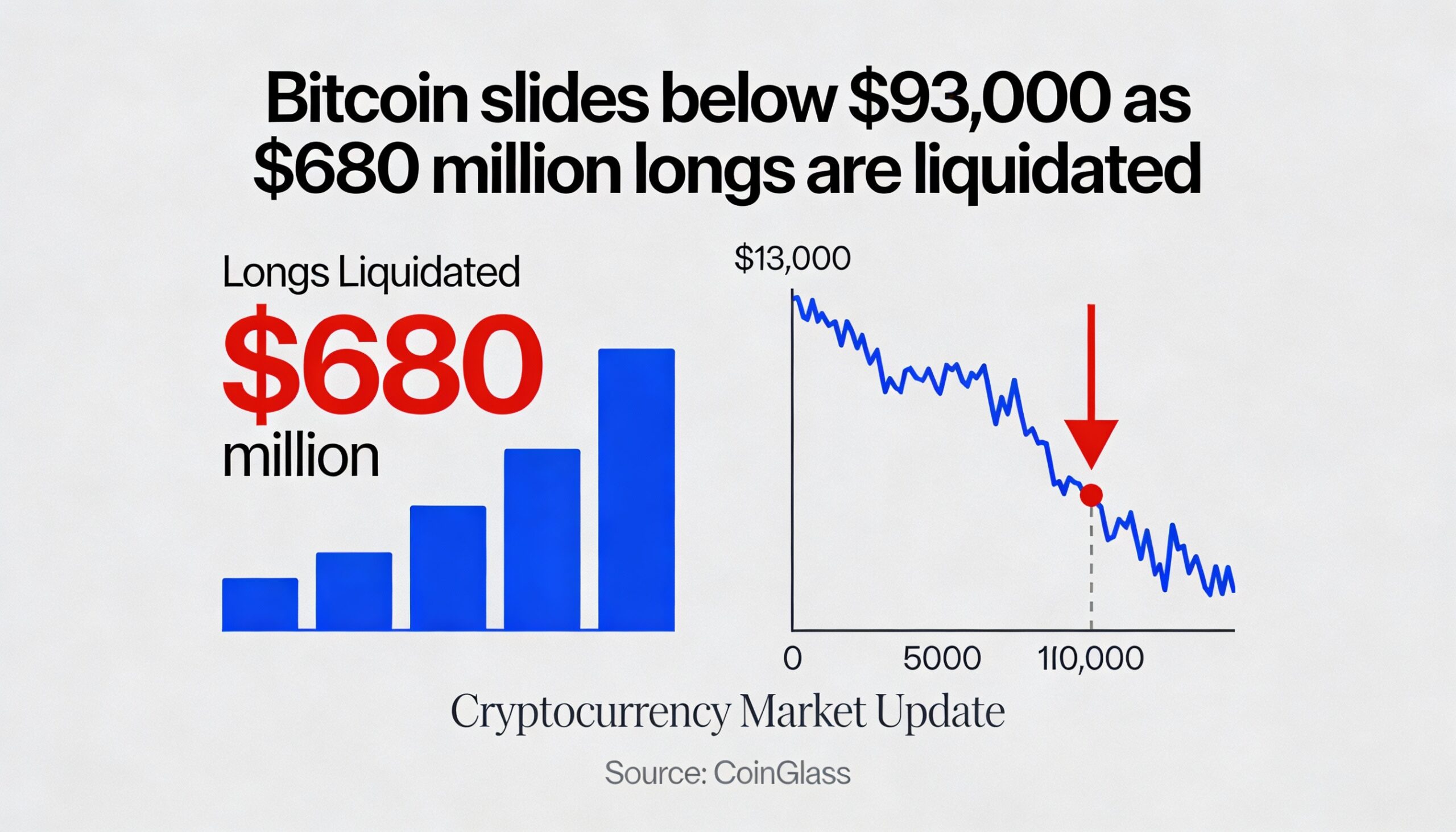 Bitcoin falls below $93,000 after $680 million in long positions are wiped out.