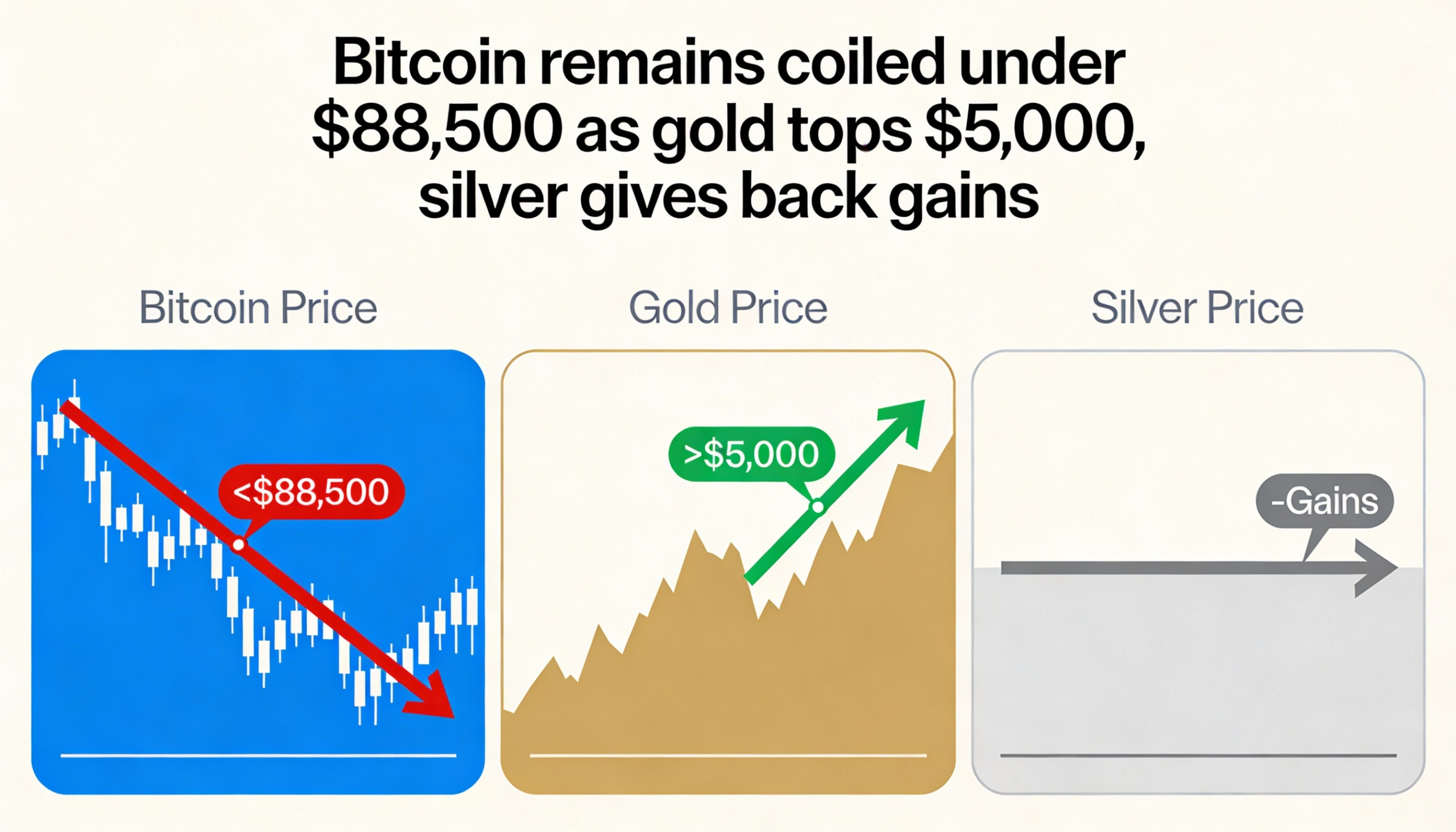 Bitcoin treads water at $88,000 while gold, silver surge begins to fade